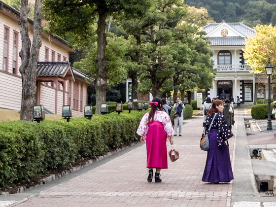 At the Haikara Isho-kan (costume house) in the 2 cho-me district, you can try on the Yagasuri and other Hakama costumes, and take pictures (800 yen). Rental costumes are only for 5 minutes.