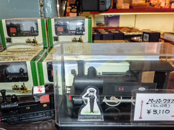 This is a paper craft kit of the Meiji-mura's steam locomotive. You can also find the Kyoto city tram version. They are available at the SL Tokyo Station Kiosk.