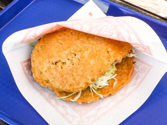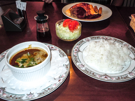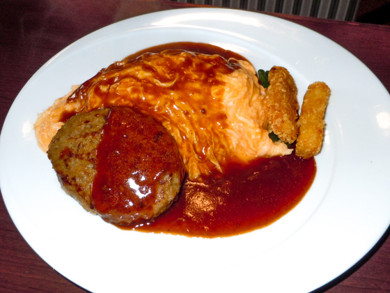 The "Rice omelet burger" (500 yen when ordered separate. 800 yen when ordered as a set) is the restaurant's bestselling menu. It is a dish combining the "rice omelet" and "ground-meat steak", which appear in "Kuidouraku" a popular novel during the Meiji period.