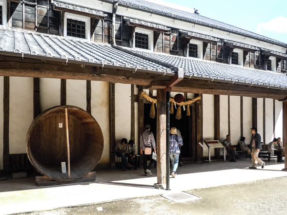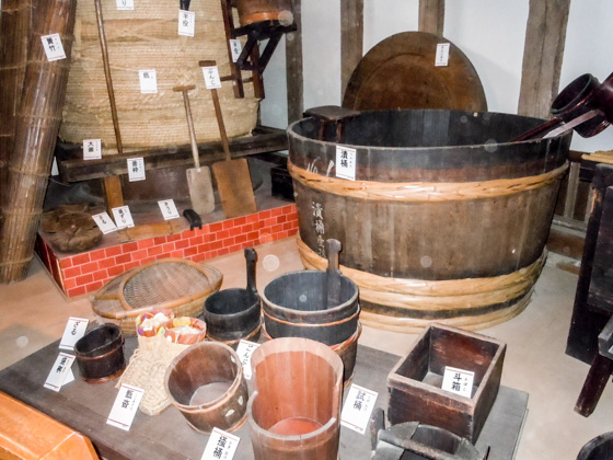 A Saké brewery with a Japanese style tile-roofing. The brewing method and tools used for making Saké are displayed.